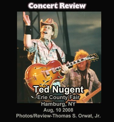 Hamburg, NY-At first it looked like another canceled show at the Erie County Fair concert grounds, (which was no more than just a stage set up on a dirt horse racing track in front of the grandstands). The performance on the prior evening by teen sensation Vanessa Hudges was canceled due to the rainy, dismal weather. And since the weather was the same on this day everyone though that the show featuring 60 year old rock legend Ted Nugent would end up the same disappointing way. An announcement was made earlier in the day on Buffalo’s rock station 97 rock, that the opening act Greg Rollie would not be performing and Nugent would go on at 8pm to hopefully beat the bad weather. Well, when 8pm passed and the clouds became darker it looked like the show would not go on. At 8:30 some people started leaving the grounds which by this time turned into a rain soaked mud pit. Just when it looked like the show was going to be called off, the sudden high pitch sound of feedback came wailing through the speakers. Nugent then bounced on stage emphatically announcing, “This ain’t nothing, this is ducking hunting weather and I’m a duck hunter!!!” The crowd of approx 4000 enthusiastically roared in approval. From this moment on, the Nuge had the crowd in the palm of his hand.